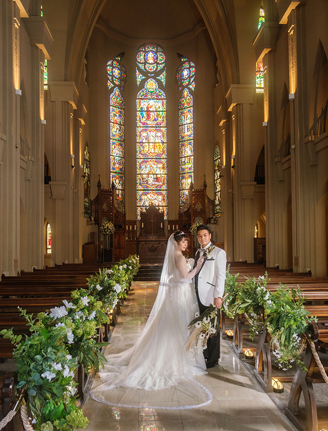 忙しくて結婚式を挙げられなかった、披露宴まではしなくてもいい、お二人の記念日など使い方は様々です。マリエール大洲のセントマリアンヌ大聖堂での撮影も可能です。